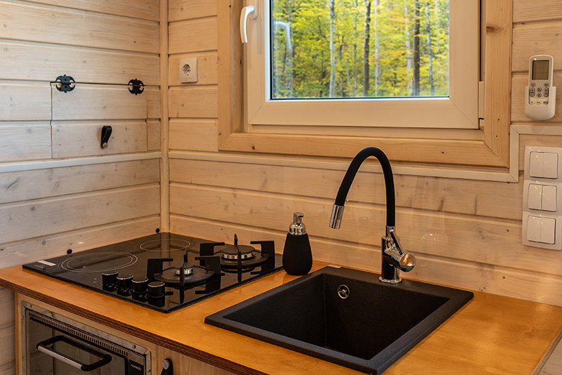 Auf Wunsch bieten wir Ihnen gegen Mehrpreis einen Frischwassertank mit automatischer Pumpe sowie zwei separate Abwassertanks für Grau- und Schwarzwasser. Damit ist Ihr tinydomo Campingplatztauglich.