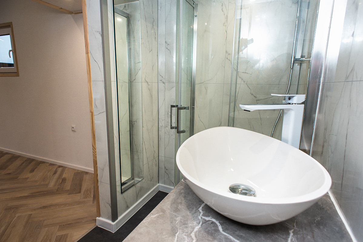 • Bathroom interior paneling made from Fibo wall elements, a high-quality and aesthetic wall system with a 25-year warranty. The wall elements are available in a variety of styles, whether you prefer a traditional look, bold high-gloss colors, or nature-inspired tones like marble and concrete.