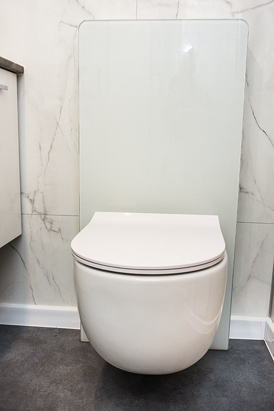 • Wall-mounted rimless ceramic toilet and toilet seat with automatic lowering and toilet cistern with an elegant glass and aluminum finish in white or black.