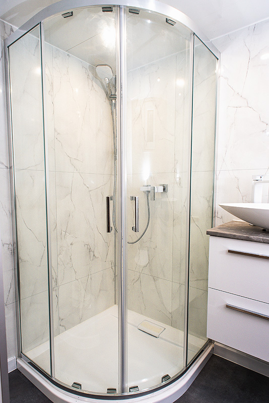 • Semi-circular corner shower tray 80 x 80 cm with real glass shower enclosure made of laminated safety glass with 2 sliding doors and a designer shower system with massage jets for an exceptional showering experience.