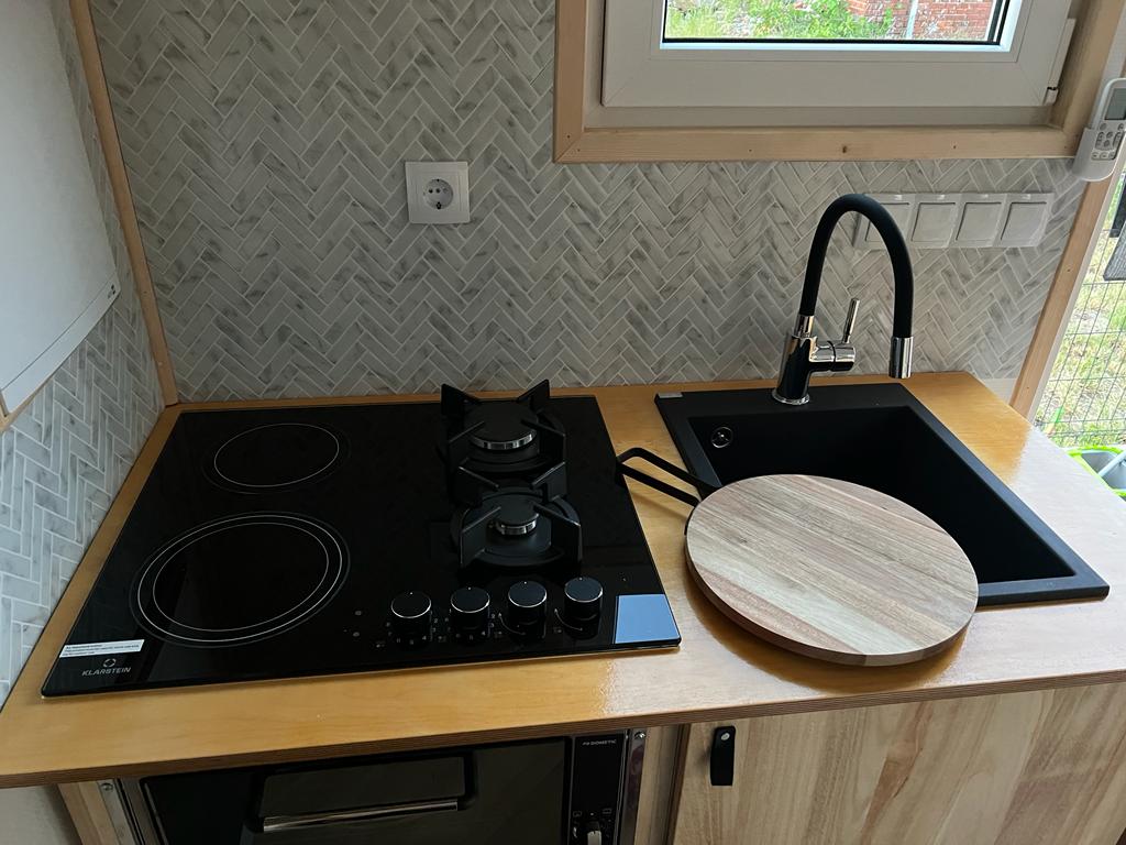 Upon request, we offer a fresh water tank with an automatic pump and two separate wastewater tanks for gray and black water for an additional charge. This makes your tinydomo suitable for camping.
