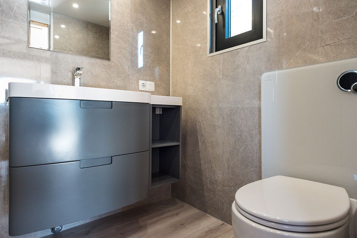 - Innenverkleidung im Bad aus Fibo Wandelementen, einem hochwertigen und ästhetischen Wandsystem mit bis zu 25 Jahren Garantie. Die Wandelemente sind in einer Vielzahl von Stilen erhältlich, egal ob Sie einen traditionellen Look, kräftige Hochglanzfarben oder von der Natur inspirierte Farbtöne wie Marmor und Beton bevorzugen oder gegen Mehrpreis aus echtem Natursteinfurnier