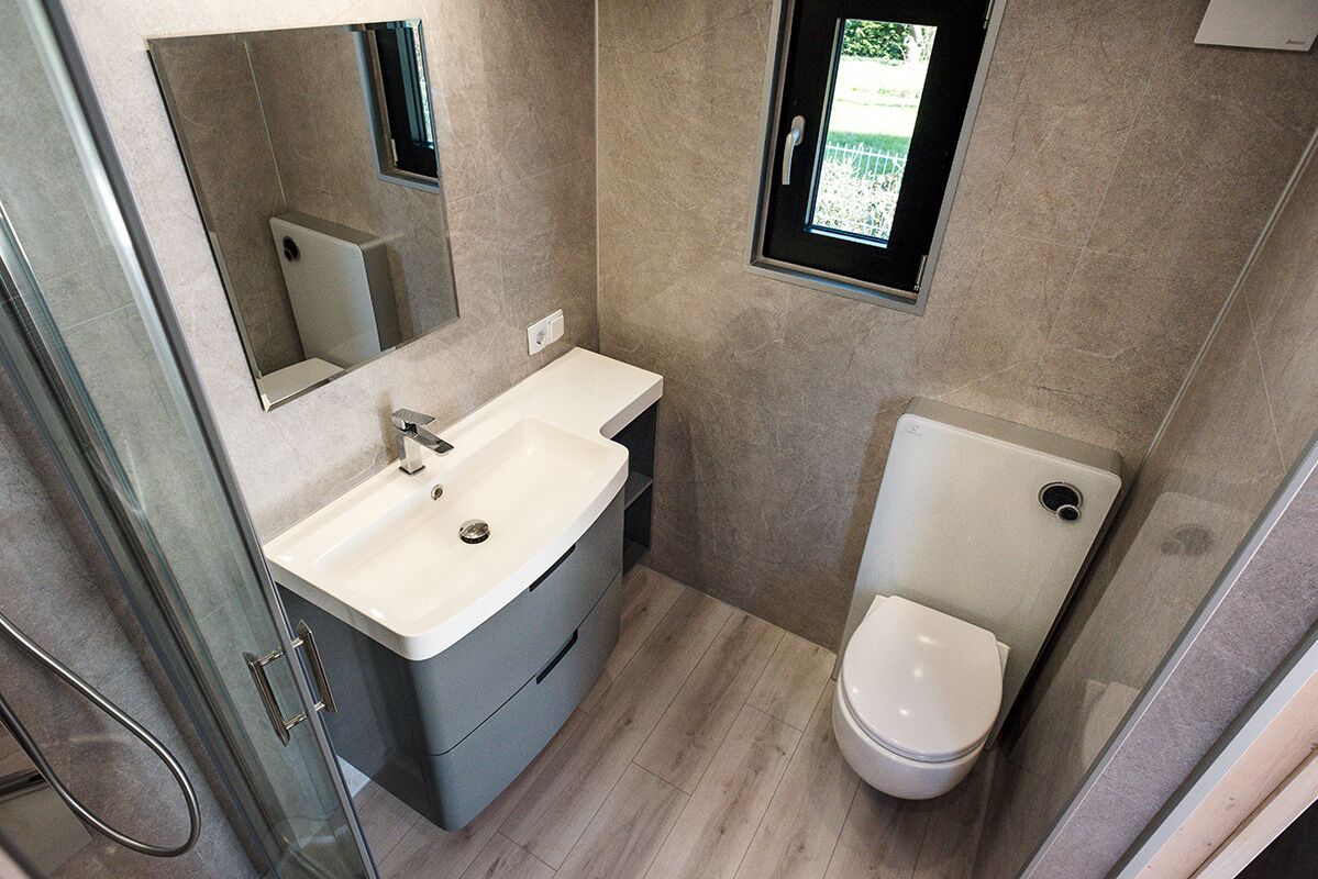 - Innenverkleidung im Bad aus Fibo Wandelementen, einem hochwertigen und ästhetischen Wandsystem mit bis zu 25 Jahren Garantie. Die Wandelemente sind in einer Vielzahl von Stilen erhältlich, egal ob Sie einen traditionellen Look, kräftige Hochglanzfarben oder von der Natur inspirierte Farbtöne wie Marmor und Beton bevorzugen oder gegen Mehrpreis aus echtem Natursteinfurnier